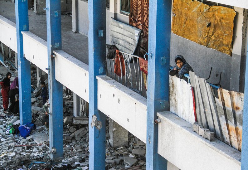 صورة: فلسطينيون في مدرسة تحولت ملجئاً ثم دمرتها غارة جوية إسرائيلية في مدينة غزة في 16 نوفمبر 2024 (مصدر: محمود زكي/Alamy Live News)