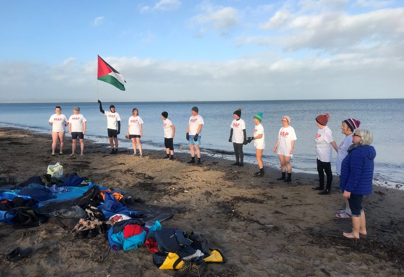 The Palestinian flag was raised, and off we went. 13 degrees on the beach – how nice. The water however was ice. I am sure it was warmer last year.