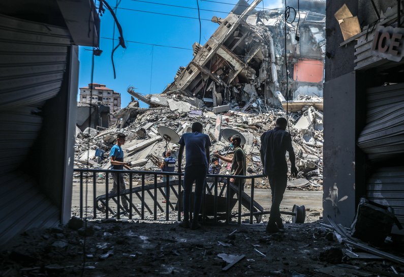 Photo: Palestinians in Gaza looking on at buildings destroyed during Israel's May 2021 offensive. (Credit: Mohammed Zaanoun).
