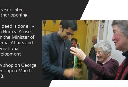 Here is Runa with Margaret Mungavin in 2003, at Hadeel’s official opening at what was then St George’s West Church, in Shandwick Place. She is wearing the Crafaid waistcoat.