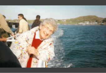 In 2017, aged 96, Runa was on Iona for Community Week. She had asked me if I would be willing to give her a lift. At that time I didn’t know that the CalMac ferry from Oban had a lift from the car deck up to the main deck. This didn’t seem to worry Runa, who duly made her way from the car deck up to the main deck via the 25 steepish steps.