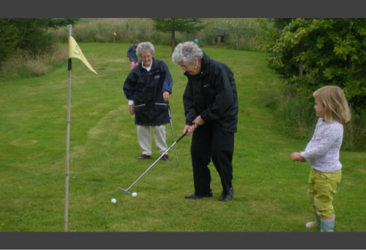Runa was much loved by her great nephew and great nieces, Thomas, Eva, Emilia and Inez, and great great nieces Nico and Robin, becoming honorary granny after our mum died. She always enjoyed hearing our news and joining family activities. Her birthday fell at the end of July, so we always held a big family get-together at our home in Carlops, which often included a round of golf in the garden! Thank you for being here with us today.
