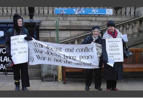 Runa was with us for many years in the Edinburgh Women in Black (WIBE) - a women's vigil for peace wearing black to signify mourning for all those dead in or from conflict, or violence. It began in Jerusalem, in protest at the occupation of Palestine, and in the UK has stood in London and Edinburgh since 2001, in response to the Us/UK invasion of Afghanistan and then Iraq. There are groups elsewhere, such as Leeds and Bradford, and far beyond. The women involved stand up for alternatives to war and oppose the escalation of violence caused by war.
