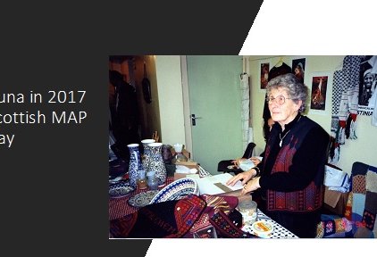 Now, about Scottish MAP. Prior to the formation of MAP there was West of Scotland Friends of Palestine, and I want to pay my condolence to the late Pam Lister’s family. We salute Pam’s unwaveringly support of Palestine from the days when it was an act of supreme courage to do so. So it was natural that the first home for Scottish MAP was in Glasgow. Years later, Runa Mackay worked from her home in Edinburgh, organising Scottish MAP and holding fundraising events for MAP.