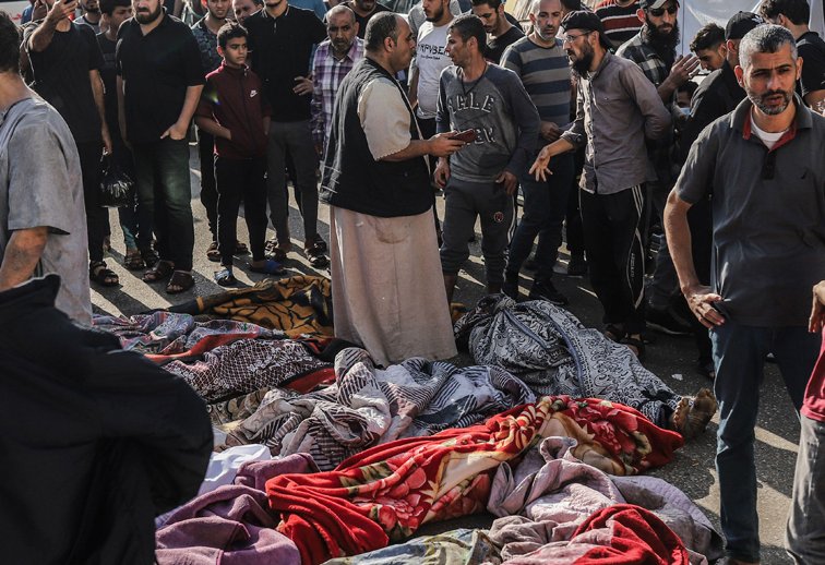 Photo: Palestinians inspect the bodies of victims who were killed in the Israeli bombardment as they lie outside Al-Shifa Hospital. (Credit: Mohammad Abu Elsebah/DPA/Alamy Live News).