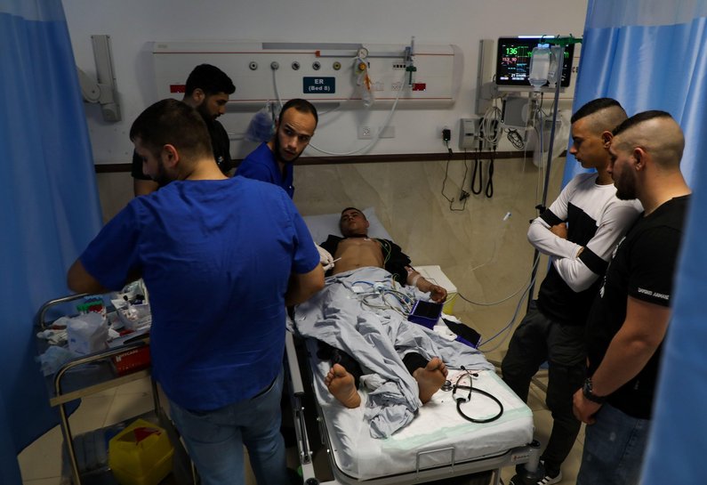 Photo: A Palestinian injured by Israeli troops during the storming of the Jenin refugee camp is treated at the Ibn Sina hospital of Jenin, 13 May 2022. (Credit: © Mohammed Turabi/IMAGESLIVE via ZUMA Press Wire).