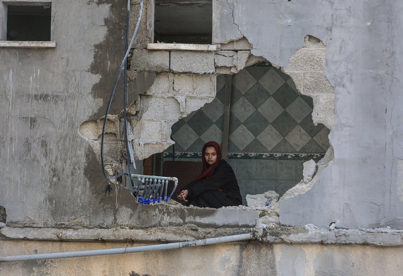 Photo: A Palestinian woman inspects a damaged house after Israeli warplanes bombed a home of the Al-Shaer family, leading to widespread destruction in the Al-Salam neighbourhood, east of the city of Rafah. (Credit: Abed Rahim Khatib/dpa/Alamy Live News).