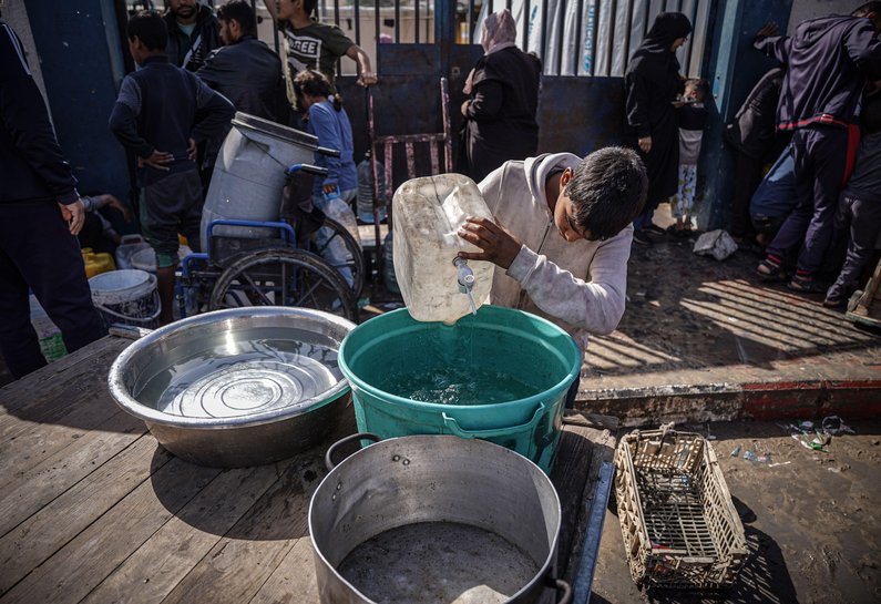 Photo: Palestinians collect water from a water filling station where people suffer from water shortages due to the war, Rafah, Gaza. (Credit: © Saher Alghorra/ZUMA Press Wire).