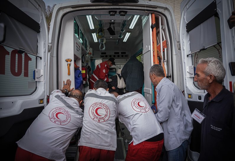 Photo: Ambulance crews transport injuries from inside the ambulance, Gaza, 26 April 2024. (Credit: © Saher Alghorra/ZUMA Press Wire).