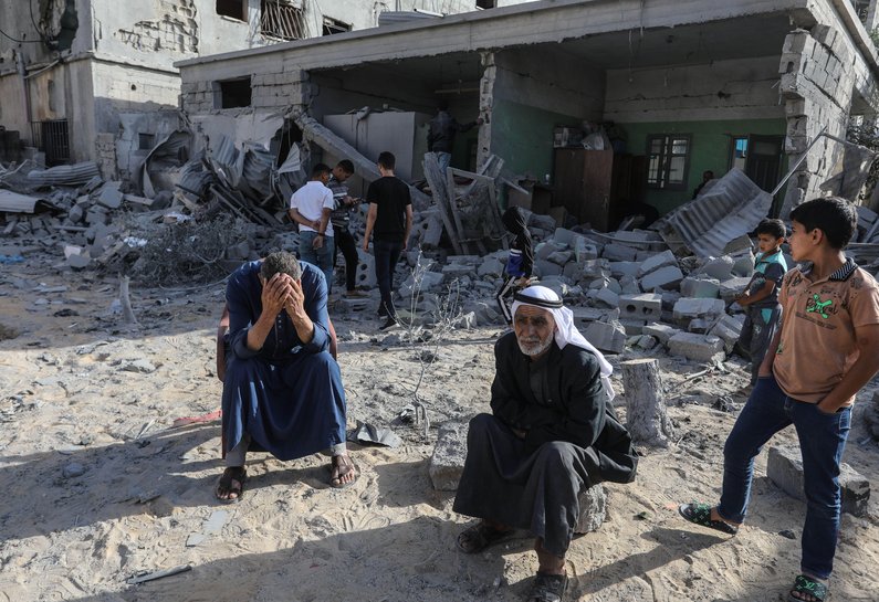 Photo: Palestinians sit in front of a damaged house after Israeli warplanes bombed a home of the Al-Shaer family, leading to widespread destruction in the Al-Salam neighbourhood, east of the city of Rafah, in southern Gaza. (Credit: Abed Rahim Khatib/dpa/Alamy Live News).