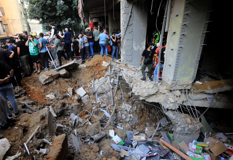 Photo: People gather near a crater caused by an Israeli air raid attack in Beirut’s southern suburb. (Credit: Alamy Live News).