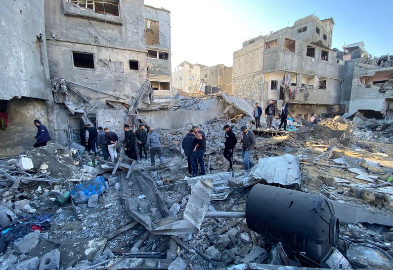 Photo: People search for their belongings amid the rubble of buildings destroyed in Israeli military airstrikes in Gaza City on 13 January 2025. (Credit: Hadi Daoud / apaimages).