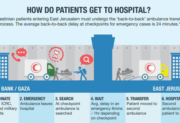 As visualised here, those requiring urgent treatment at hospitals in occupied East Jerusalem are systematically forced to transfer from Palestinian ambulances to Israeli-registered vehicles at checkpoints. This ‘back-to-back’ process is enforced even in critical and emergency cases, and can cause life-threatening delays.