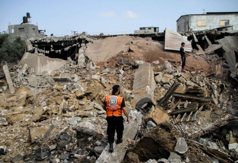 Photo: Crews of the Palestinian Civil Defence inspect the industrial facilities hit by Israeli jets on the east of the Jabalia refugee camp in the northern Gaza Strip, May 10, 2021, Gaza, Palestine. (Credit: Alamy Stock Photo).