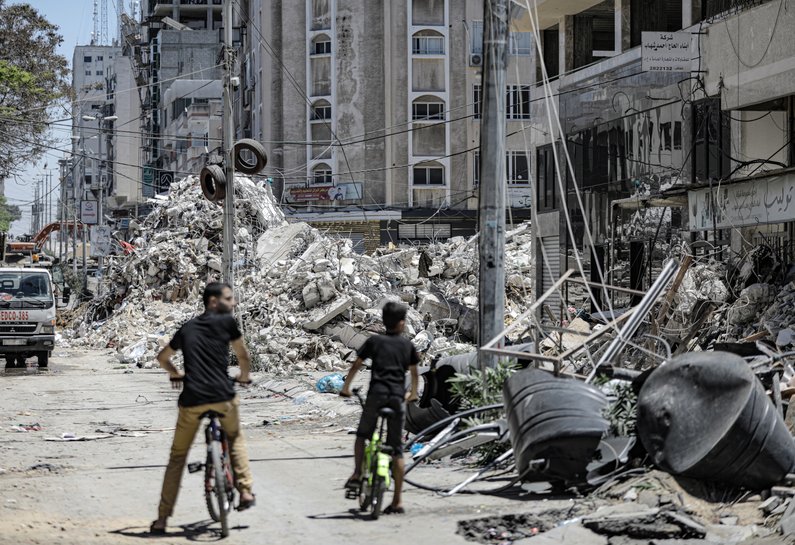Photo: Palestinians inspect a damaged tower building, which was hit in Israeli air strikes, amid a flare-up of Israeli-Palestinian violence, in Gaza City. © 2021 UNRWA photo by Mohamed Hinna.