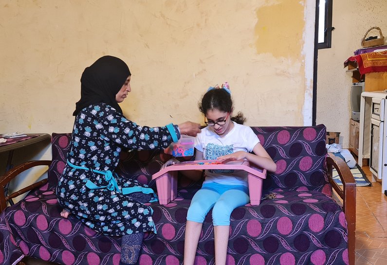 According to Siham, her daughter’s skills have developed a lot over the years. “Even though I did not complete my education, I now feel like an expert after receiving many trainings from the project’s team,” said Siham. She has received training on childhood development, positive parenting, the rights of people with disabilities and child protection, in addition to engaging in practical trainings to further develop her children’s skills at home. The latter came in handy during the lockdown period, when it was not possible to go to the centre and the parents had to implement the rehabilitation sessions at home under the remote supervision of the project’s specialists.
