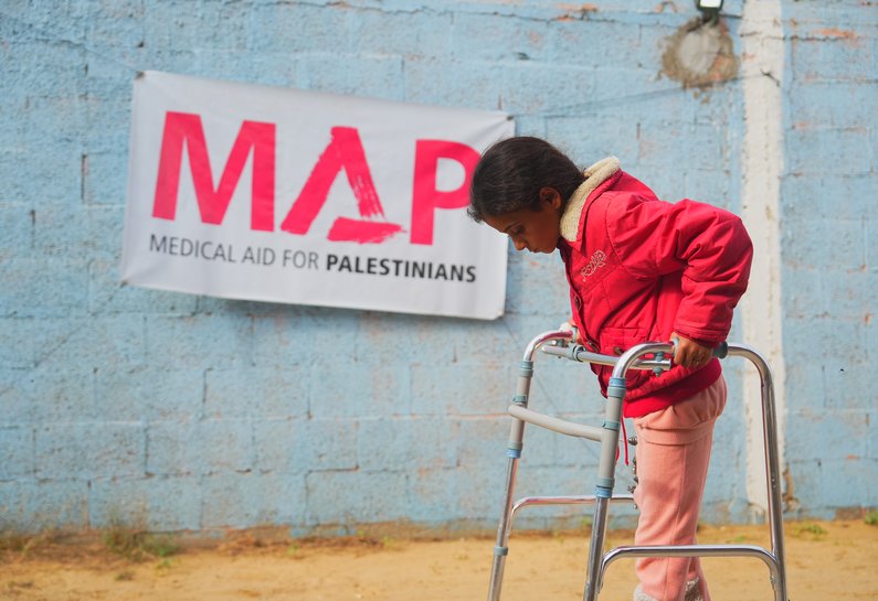 Photo: Raseel, 10, an internally displaced child, walks home with her walker after receiving wound care and physiotherapy at MAP’s Solidarity Polyclinic in Deir al Balah. (Credit Palm Media / MAP).