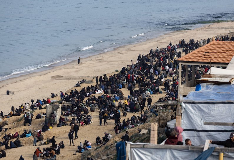 Photo: Thousands of Palestinians gather on Al-Rashid Street, west of the Nuseirat camp, at the last accessible point before the Netzarim checkpoint. (Credit: © Saher Alghorra/ZUMA Press Wire).