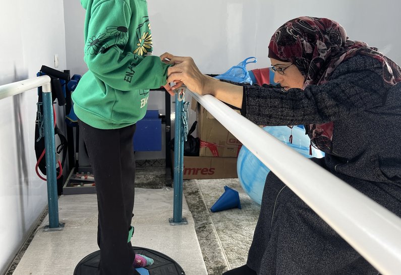 Photo: Dr Nahla Musallam, a physiotherapist, cares for a child at MAP’s Solidarity Polyclinic.