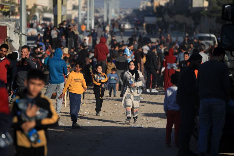 Photo: Displaced Palestinians walk while carrying water (Credit: Mohammed Zaanoun, 19 February 2024)