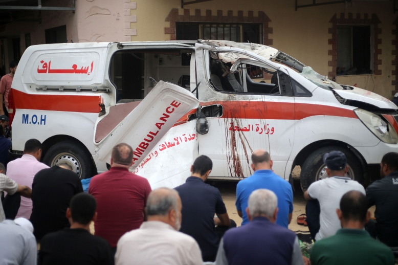 Photo: Palestinians, seated on the ground close to a damaged ambulance, take part in Friday Noon prayers in the driveway of the emergency entrance of Nasser Hospital. (Credit: SOPA Images Limited / Alamy Stock Photo).